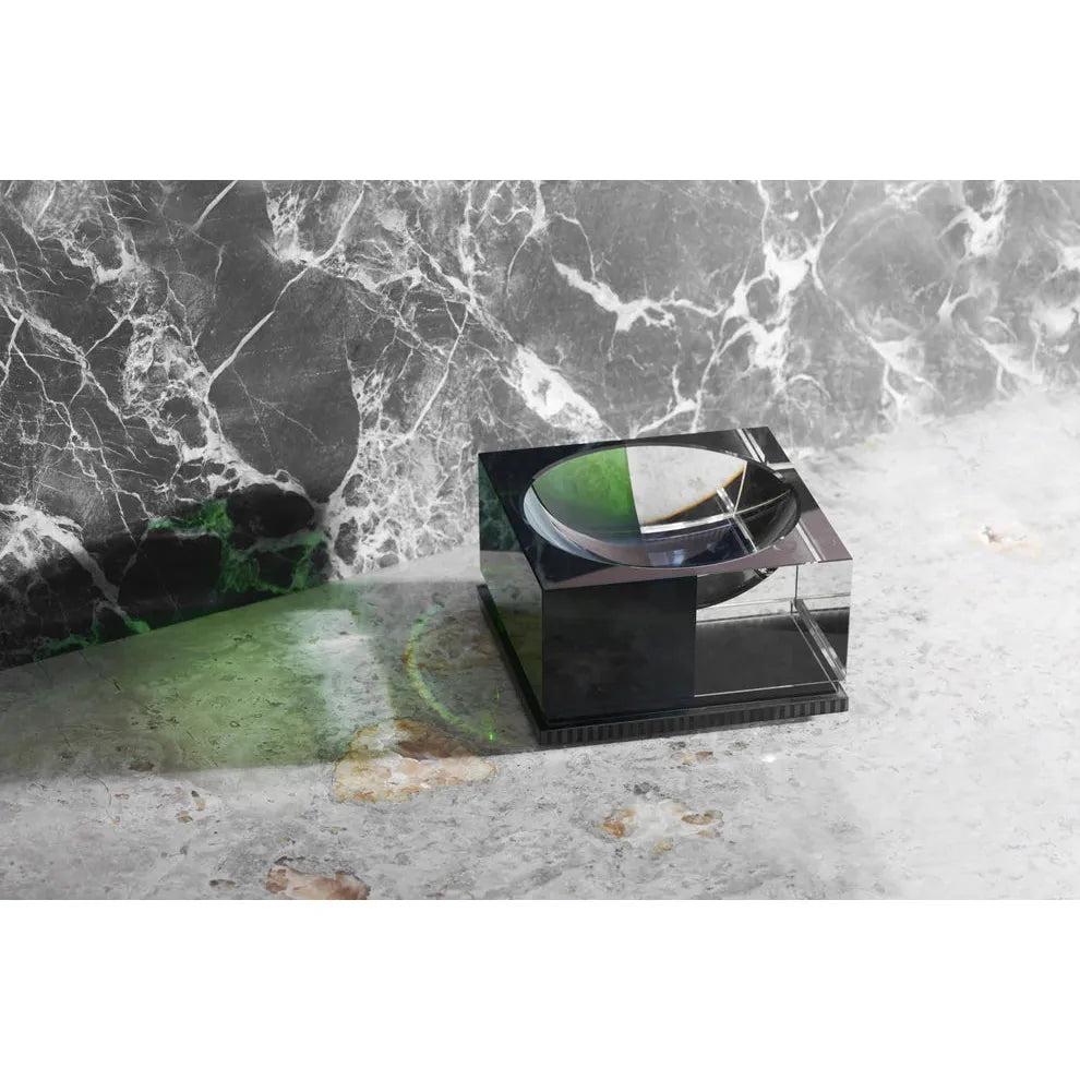 Reflections Copenhagen's Denver bowl draws inspiration from the rock 'n' roll and punk era. It is an example of the designer’s fascination with light and reflection, and can be seen when the amber, black and clear crystal hues are illuminated. It is crafted from fine hand-cut crystal and shaped into a thick cube that has a dipped, curved centre. Place it on a coffee table for a Rock n Roll inspired focal point.