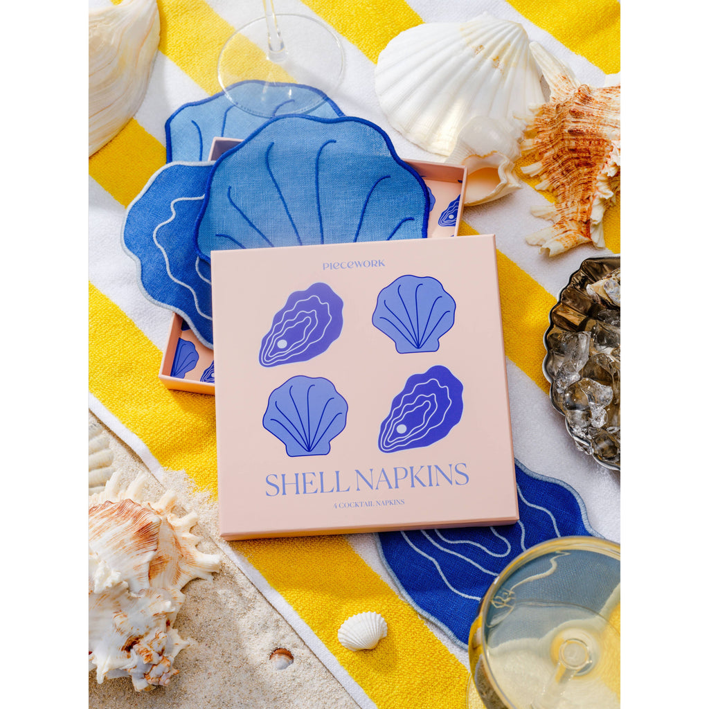 Bring the beach to your bar cart with four 100% linen blue shell-shaped napkins. Sold as a set of 4 100% Linen, embroidered with cotton thread Approximately 6 inches across Handwash in delicate detergent, air dry, and gently iron. Or, dry clean.