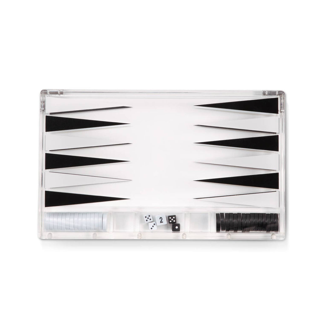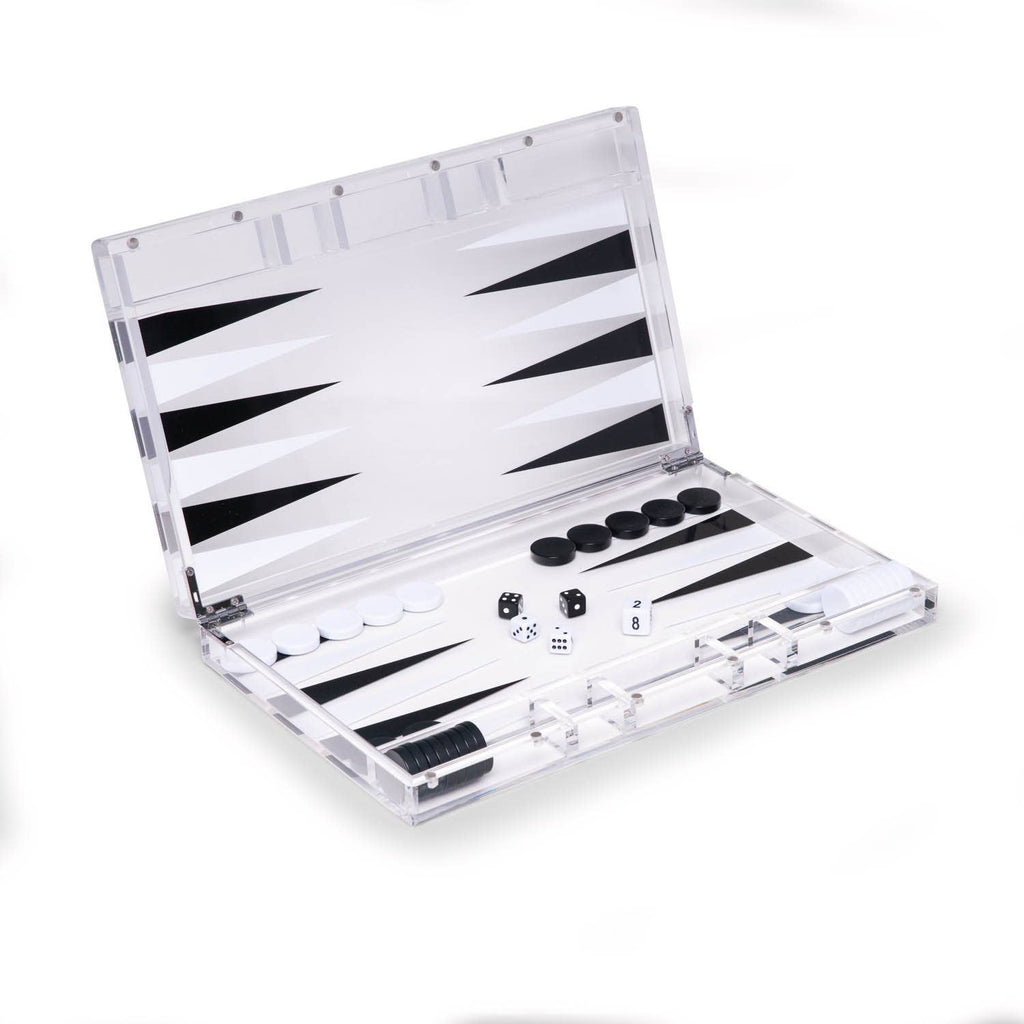 This lucite backgammon set brings a modern twist to a classic game of backgammon. It's magnetic closure and discreet hinges provide for a sleek and minimal design, perfect for any living room, game room, office or man cave - a sure conversation starter! Set includes black and white playing pieces, two sets of dice, two dice cups and a doubling dice. Acrylic 14" playing board. Magnetic closure. Color - Clear.