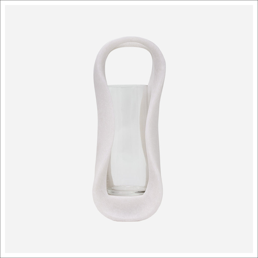 The Lester Hurricane is a sleek white candleholder with a modern hourglass shape standing 16 inches tall. Made from durable polyresin, it holds a clear glass insert to safely protect your candle’s flame. Its clean, sculptural design adds a stylish touch to any room, making it perfect for tabletops and mantels. Lightweight yet sturdy, this elegant piece effortlessly brings a warm, sophisticated ambiance to your space.