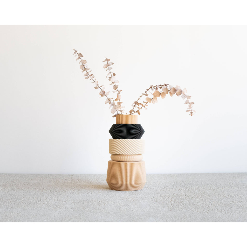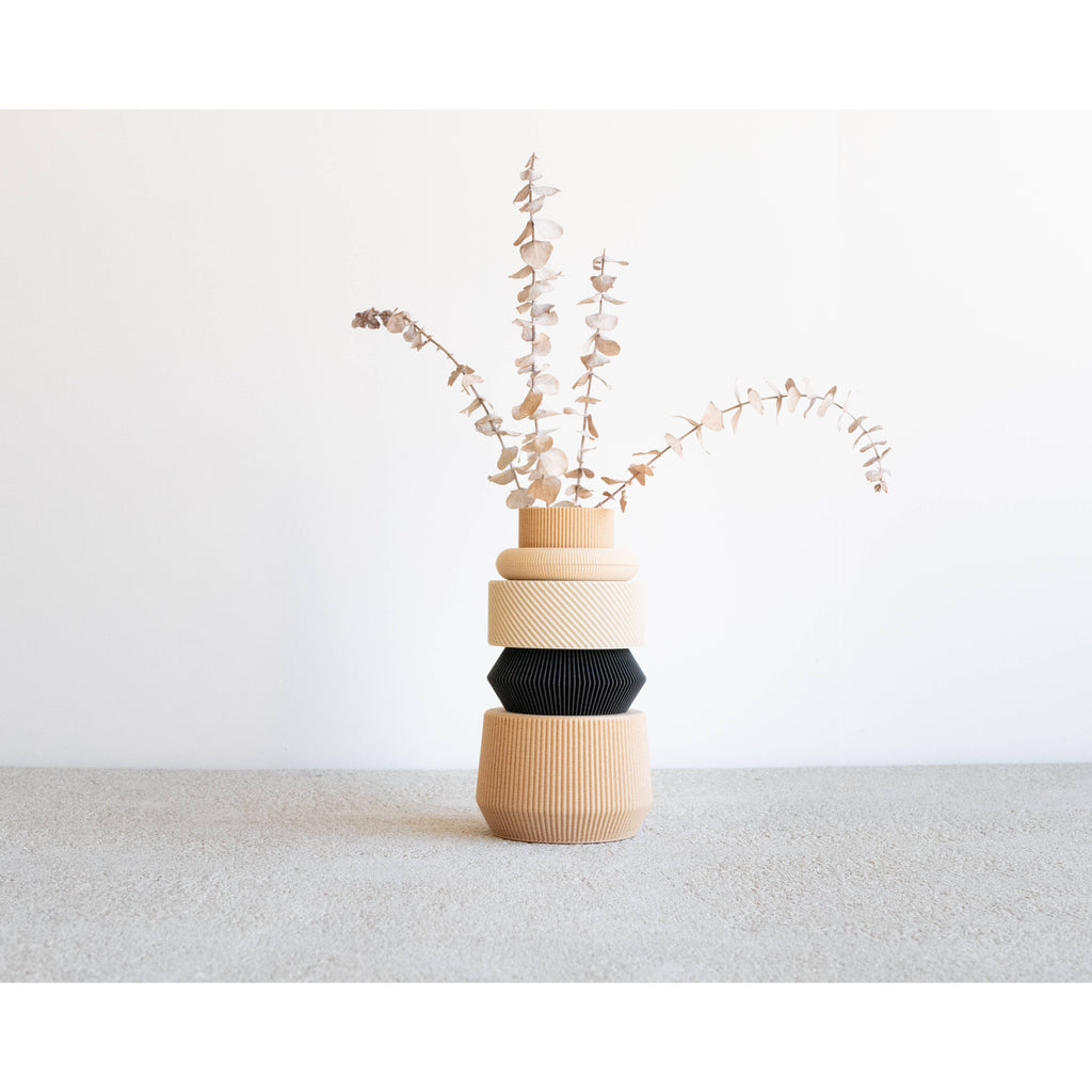 Five stackable segments let you customize this vase to match your mood and décor. At 20 cm tall with a 5.5 cm opening, it accommodates fresh or dried arrangements with understated elegance. Sustainably crafted from corn-based bioplastic and recycled wood fibers, it delivers authentic wood character while supporting the planet.
