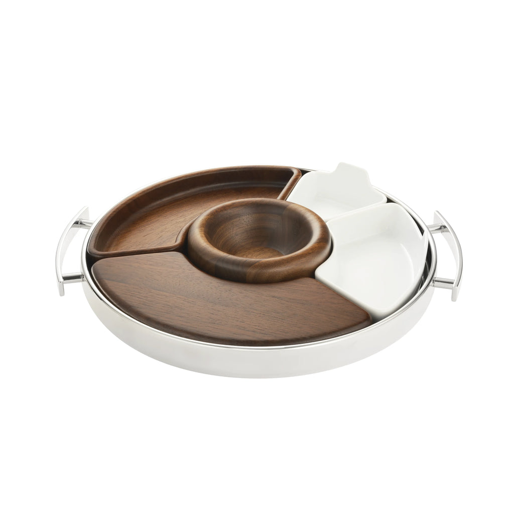 It is composed of reversible walnut wood and porcelain parts. Diameter: 12.5 in (handles included).