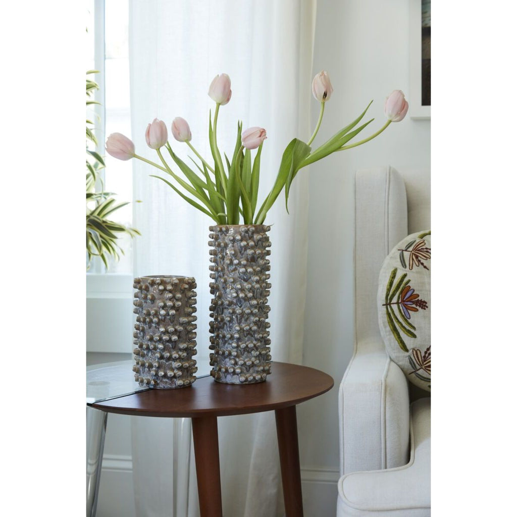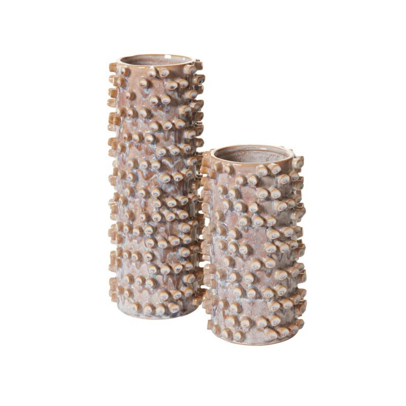 Introduce your home to the attention-grabbing Zahara Vase, a 3D creation with handmade knobs and a tan reactive glaze. Whether adorned with dried or fresh flowers or standing alone, this vase adds a fun and distinctive touch to any surface.