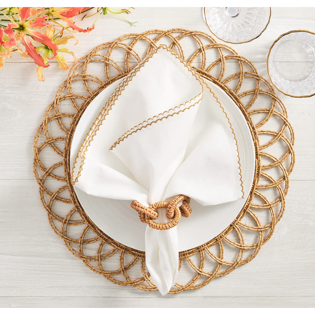 Looking for a timeless summer staple? The Rattan Link napkin ring has you covered. Classic rings intertwine in woven rattan to form a chain link, adding a chic coastal vibe to your dining table. Pair with a crisp white napkin for a classic look or use with similar natural material tablescape elements for a relaxed summer vibe.