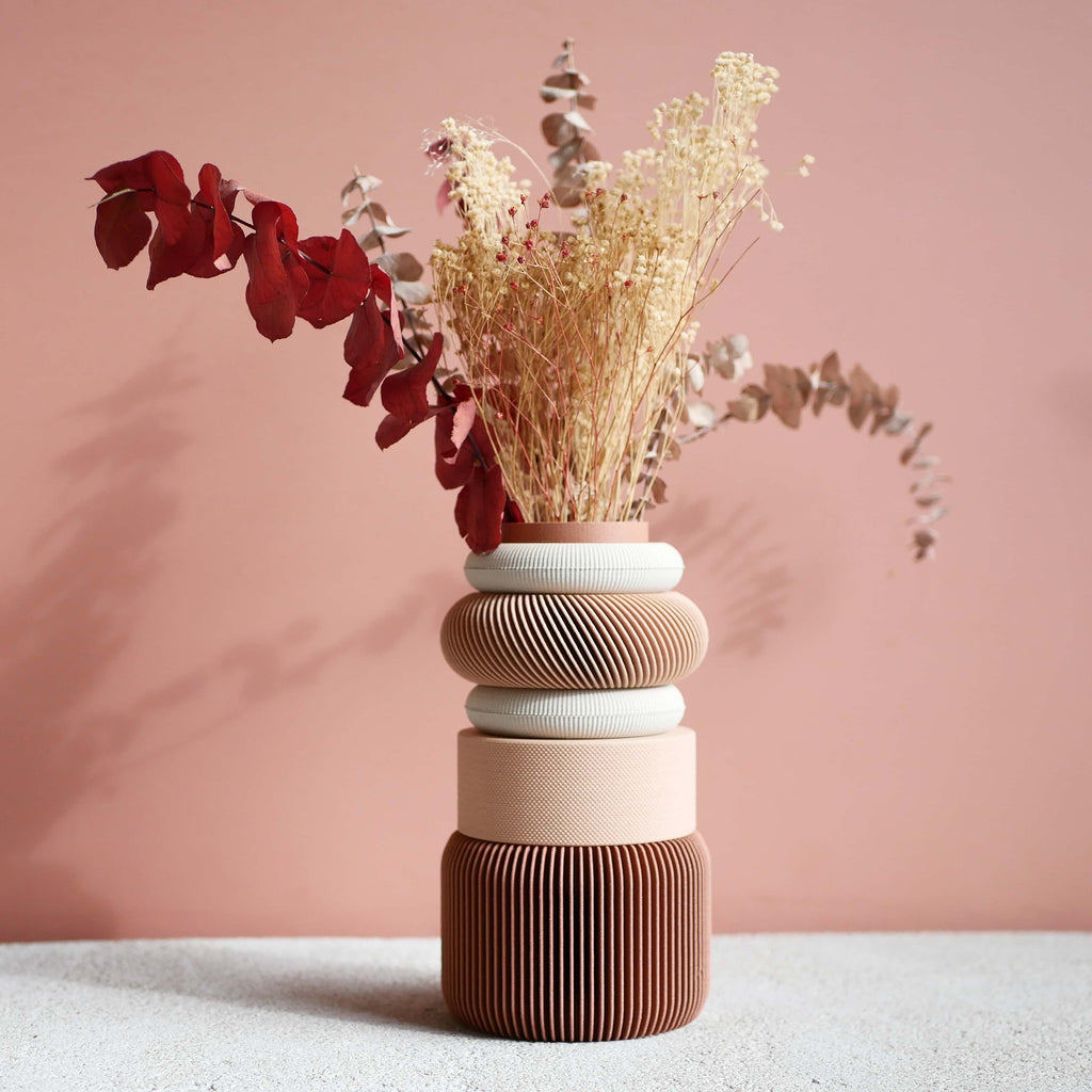 A modular vase crafted from sustainable materials—recycled wood fibers blended with bio-plastic derived from corn. Its six interchangeable segments allow you to reconfigure the design to suit your aesthetic mood, creating endless visual possibilities. Standing 20 cm tall with a 5.5 cm inner diameter, this piece brings refined, natural elegance to any space.