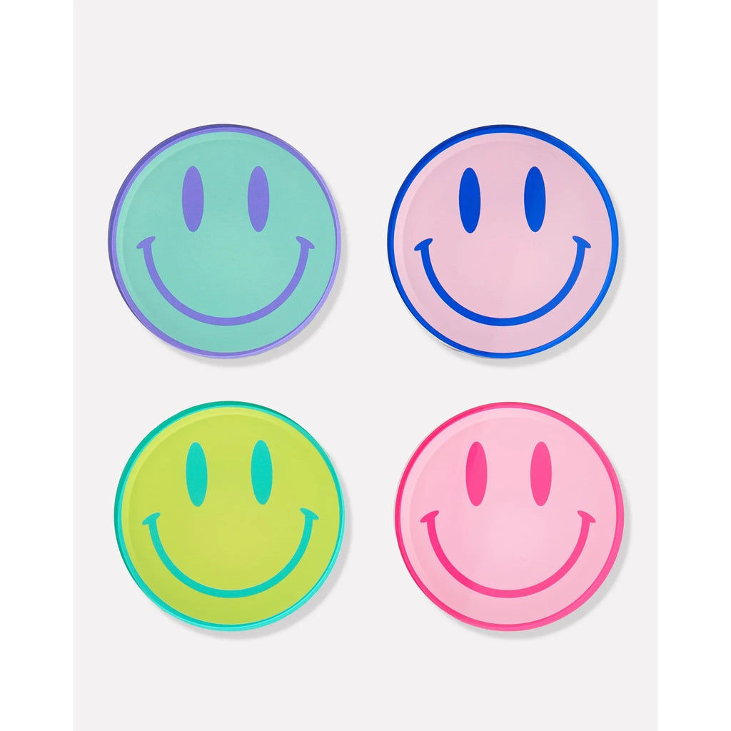 Sip and smile with this set of 4 coasters! Crafted from colorful acrylic, these cheeky coasters feature a fun happy face - sure to bring an instant grin to any beverage. Keep your table free from drips and spills, and happy vibes flowing round the room. And, let's be honest, what's better than a coaster that smiles back?!