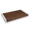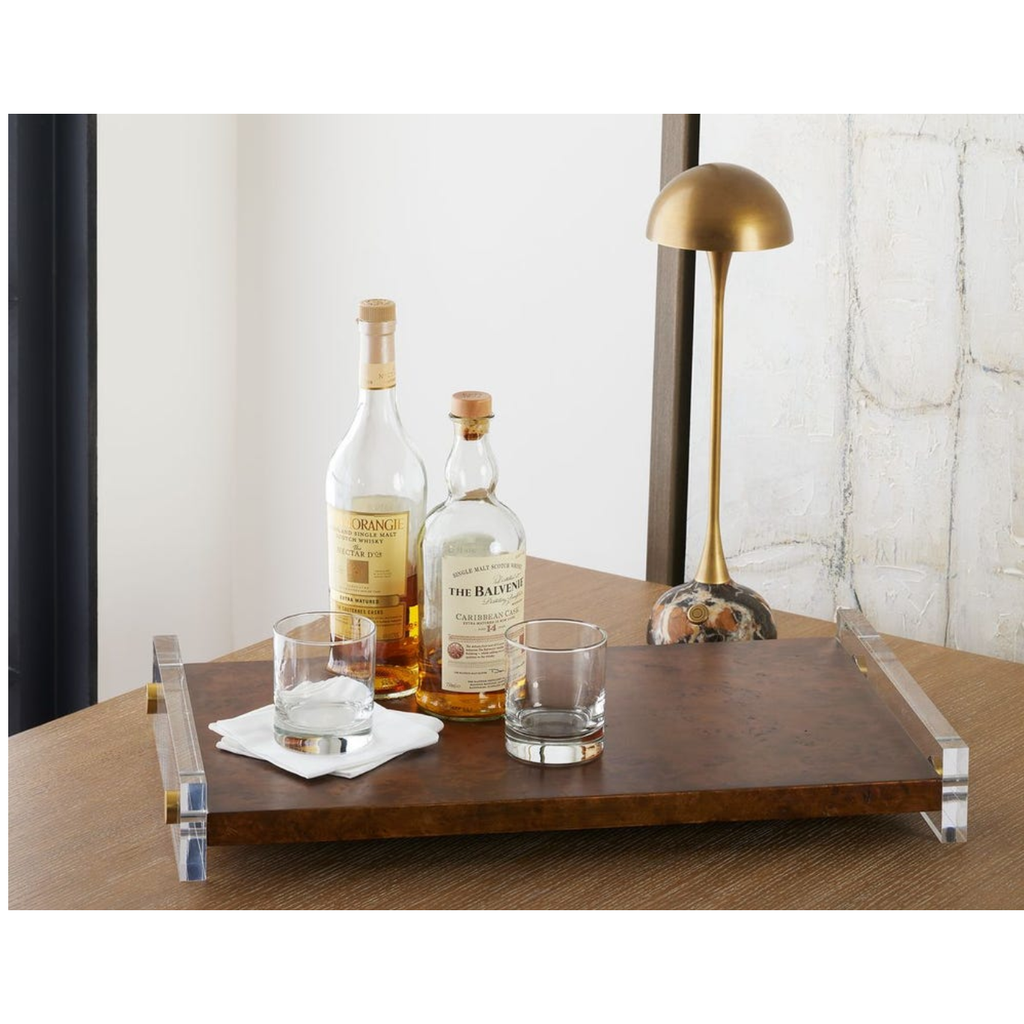 An expanse of burl wood in walnut finish is suspended between thick acrylic panels, appearing to float. Includes fasteners in a polished brass finish.