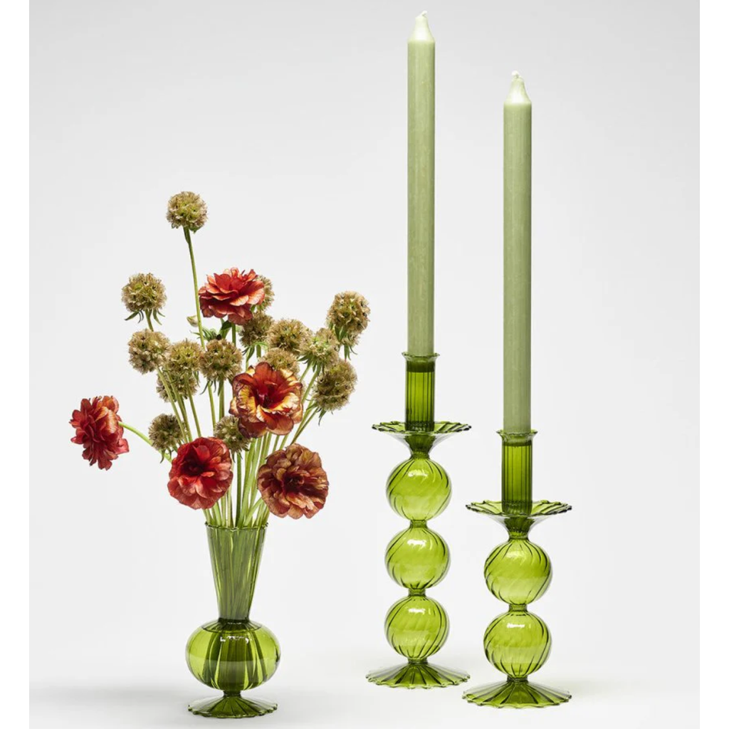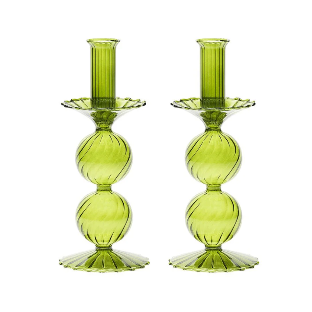 The delicate, hand-blown glass Bella Candlestick features two stacked globes atop a scalloped base. This stunning glass candlestick adds movement and sophistication to any table.
