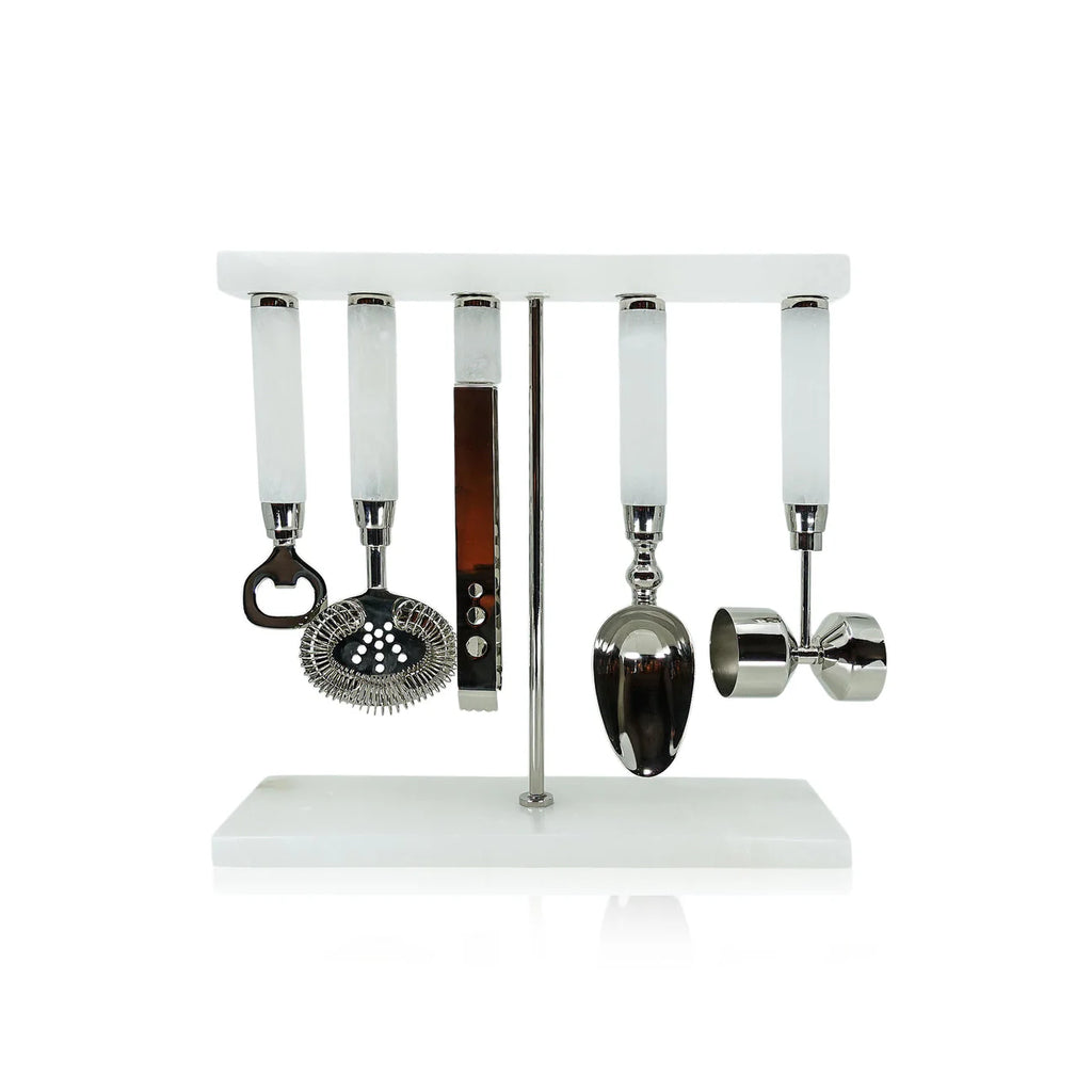 Experience the luxury and sophistication of our Five Piece Bar Tool Set. Crafted from beautiful alabaster, this set adds a touch of elegance to your bar. Impress your guests and elevate your mixology skills with this exquisite bar tool set.