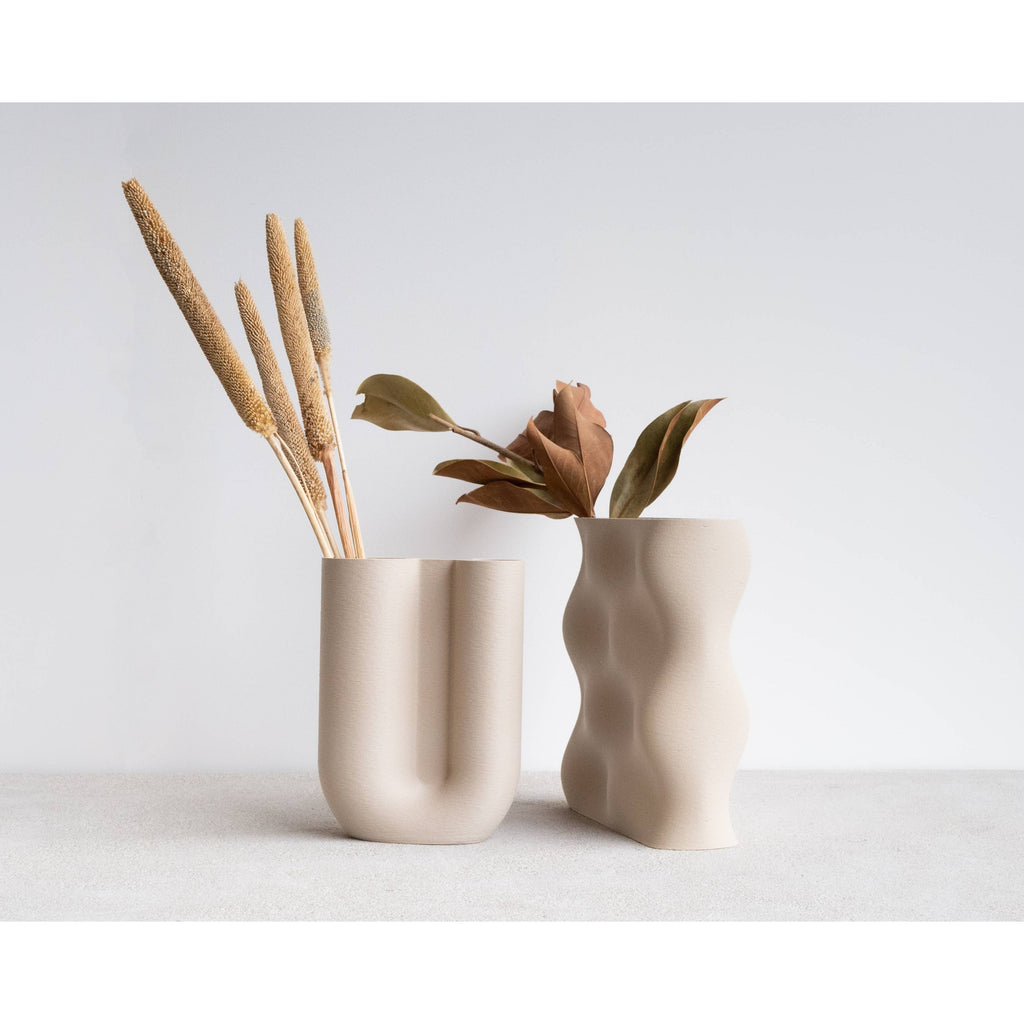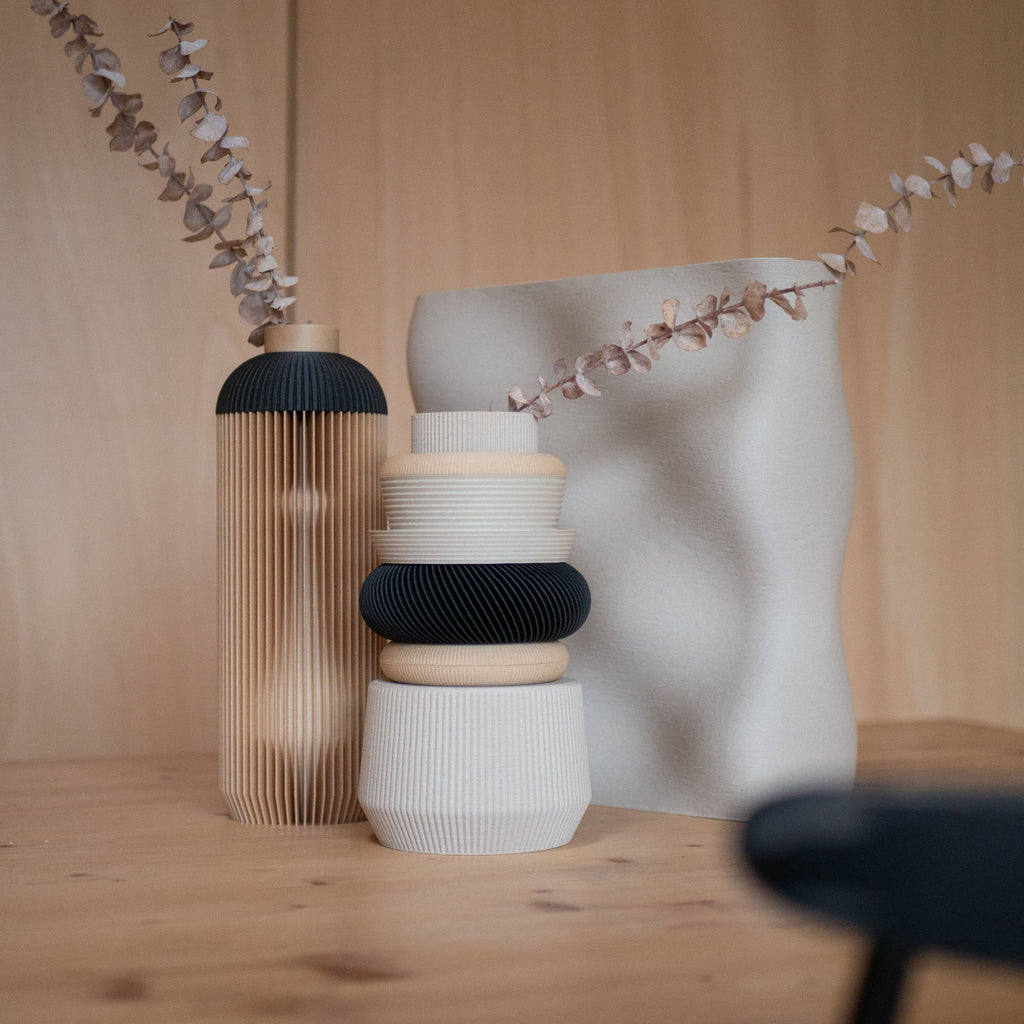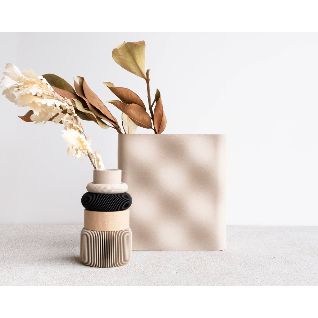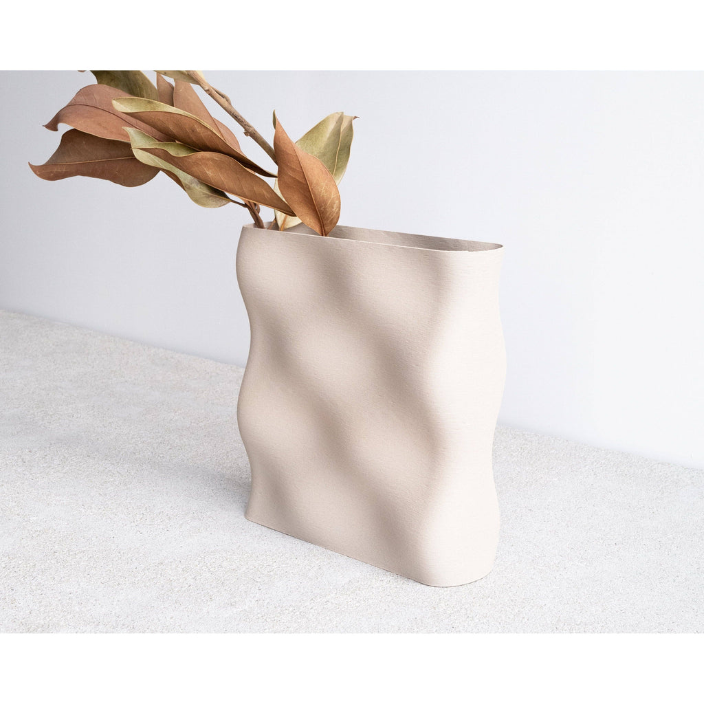 Abby Vase brings organic elegance to any room with its sculptural wave-textured design that shifts beautifully with light and perspective. Crafted from recycled wood fibers and corn-based bioplastic, this eco-conscious piece measures 28 cm tall with an 8 x 26 cm inner diameter—ideal for displaying dried flowers or paired with a waterproof container. Handmade in France, it combines sustainable materials with refined aesthetics for the conscientious home.