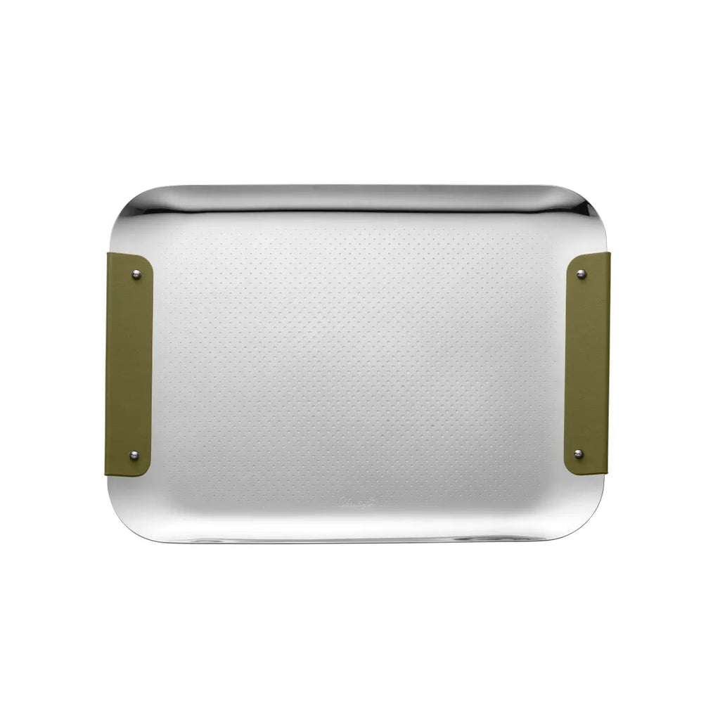 This elegant 13 x 9 inch rectangular tray features Christofle's signature imperial green leather handle, making it a sophisticated addition to any space. The dotted pattern design brings modern style to your desk, shelf, or entryway. Perfect as a thoughtful gift or personal accent piece.
