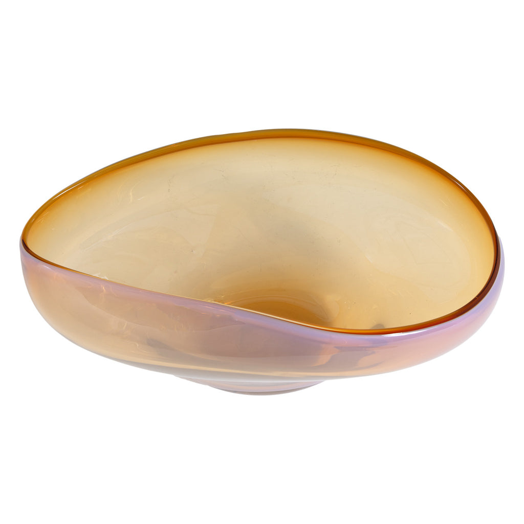This elegant art glass bowl brings understated sophistication to any space. Measuring 16L x 9W x 7H, the Harp Bowl features a warm amber tone with translucent qualities that shift beautifully in light. Its organic, fluid edges and open form create visual interest from every angle, while the generous width accommodates florals, seasonal displays, or stands beautifully on its own. Crafted from premium art glass, this versatile piece works as a striking centerpiece or layered within a curated tabletop arrangement.