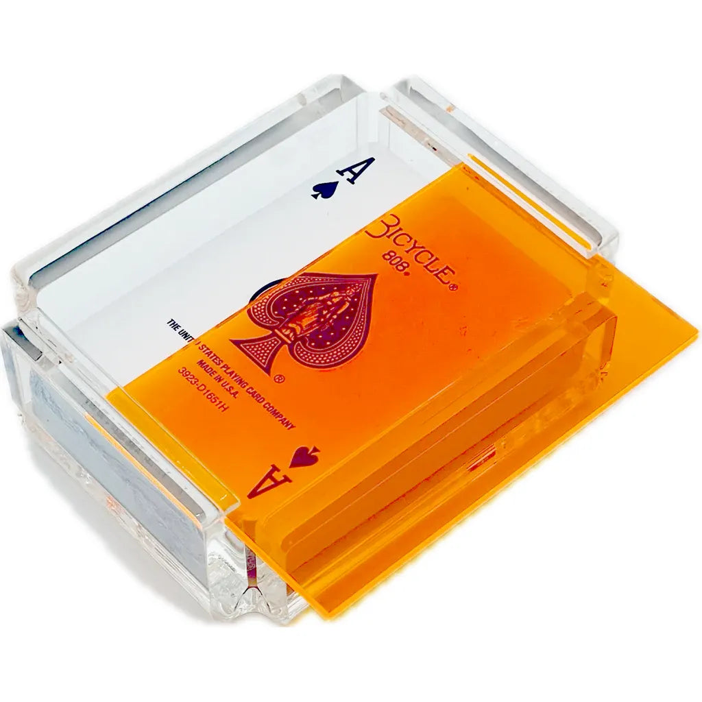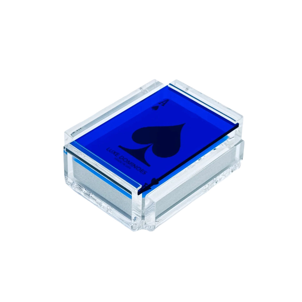 This unique playing card deck is handcrafted in Miami from a single piece of acrylic. Each set includes Bicycle 808 Standard Index playing cards in vibrant blue and red designs. With durability and air cushioning, you'll enjoy the perfect playing experience no matter what game you choose. (No joke, it's that good - trust us!)