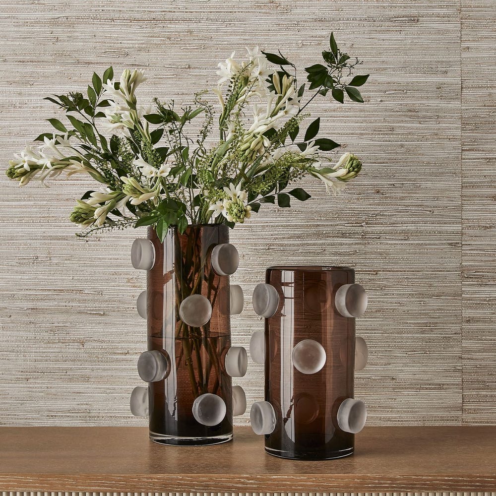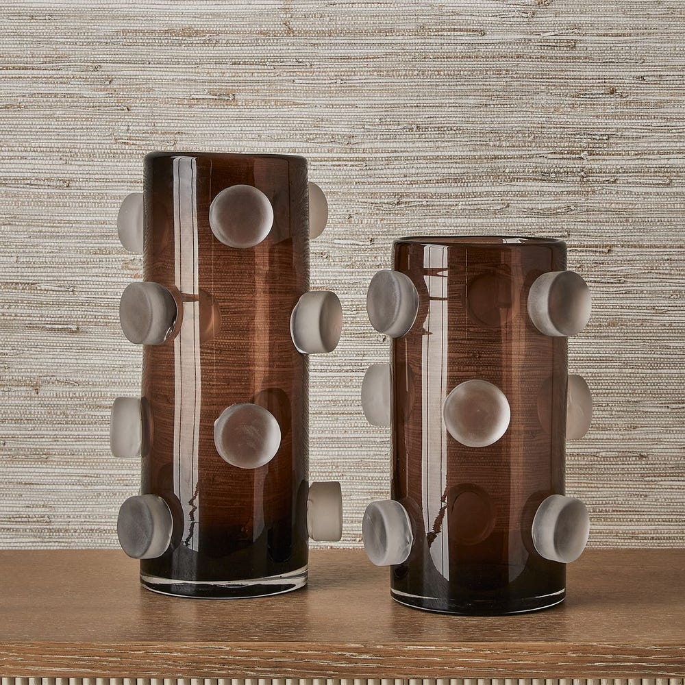 A set of two chocolate glass vases receive playful arrangements of frosted pucks, creating texture and visual interest.