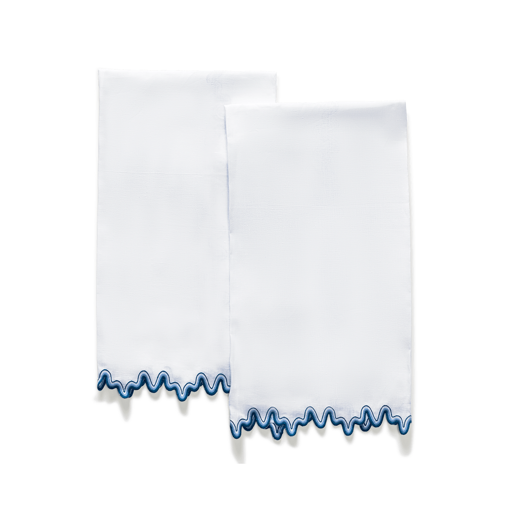 This eye-catching linen guest towel is guaranteed to add a splash of joie de vivre to your powderroom. Meticulously embroidered, it features a two-tone wave border on linen.