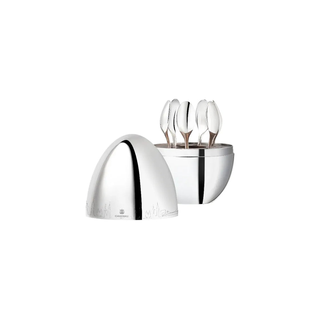 Set of 6 silver-plated espresso spoons featuring an engraved New York City skyline design. Each spoon comes nestled in an elegant egg-shaped case with mirror-polished steel exterior, walnut wood interior, and resin base. Perfect for coffee enthusiasts who appreciate both functionality and style, these decorative pieces add a sophisticated New York touch to any kitchen, dining room, or living space. Ideal for daily use or special occasions.