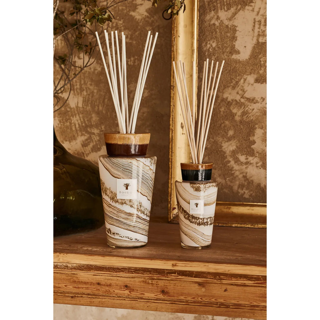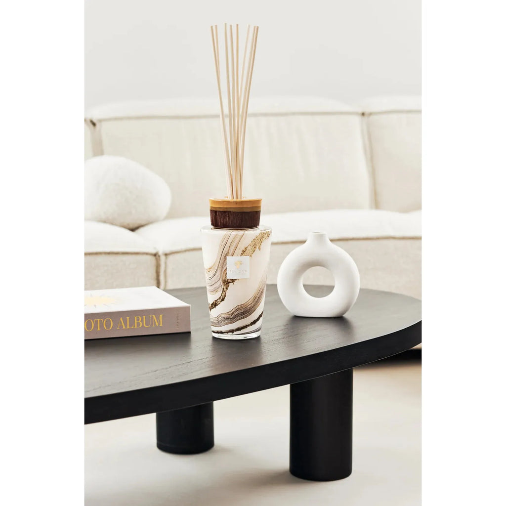 The Totem Siloli diffuser, available in 2 and 5 liters, is finished with a brown and beige handmade ceramic stopper that matches the colors of the glass. It claims its place in an interior as a unique and refillable decorative object.