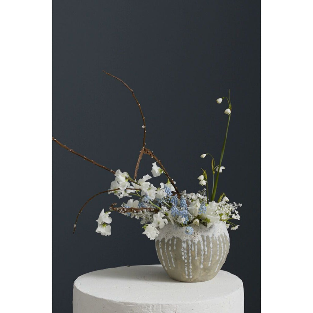The Thalia Pot, crafted from ceramic, draws inspiration from the beach. Each piece is designed with a hand-crafted bubble effect, creating a sea foam-splashed appearance reminiscent of waves crashing on the sand. Despite its unique shape, this pot can easily accommodate drop-in pots and beautifully showcases both fresh and dried botanicals.