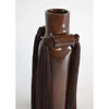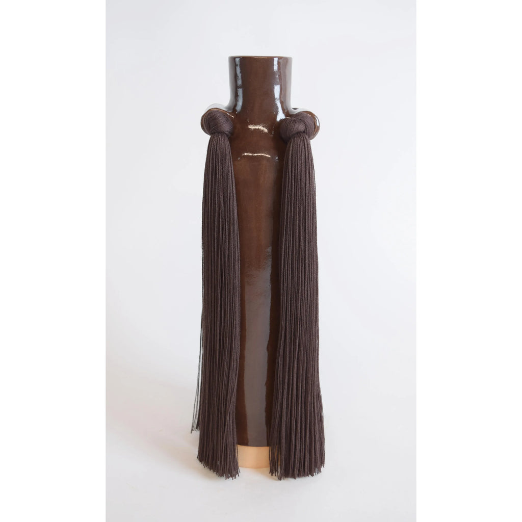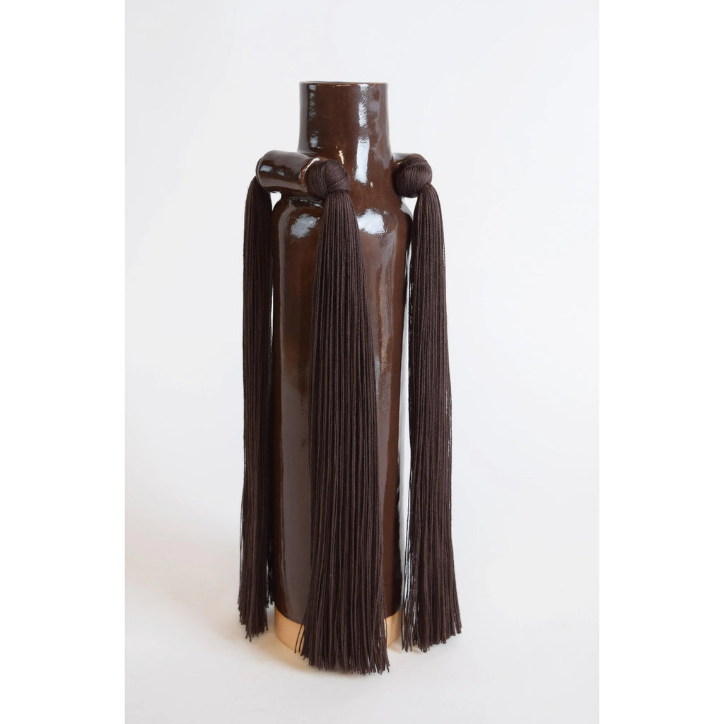 Hand formed beige stoneware with brown glaze. Dark brown cotton fringe detail. Inside is glazed, vessel will hold water.